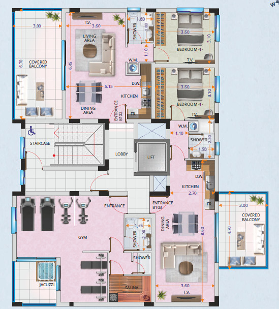 The building is complemented by premium lifestyle amenities, including a fully equipped gym, a sauna, and a communal swimming pool surrounded by a beautifully landscaped park. Each apartment benefits from a covered parking space and a private storage room on the ground floor, ensuring convenience and practicality.
